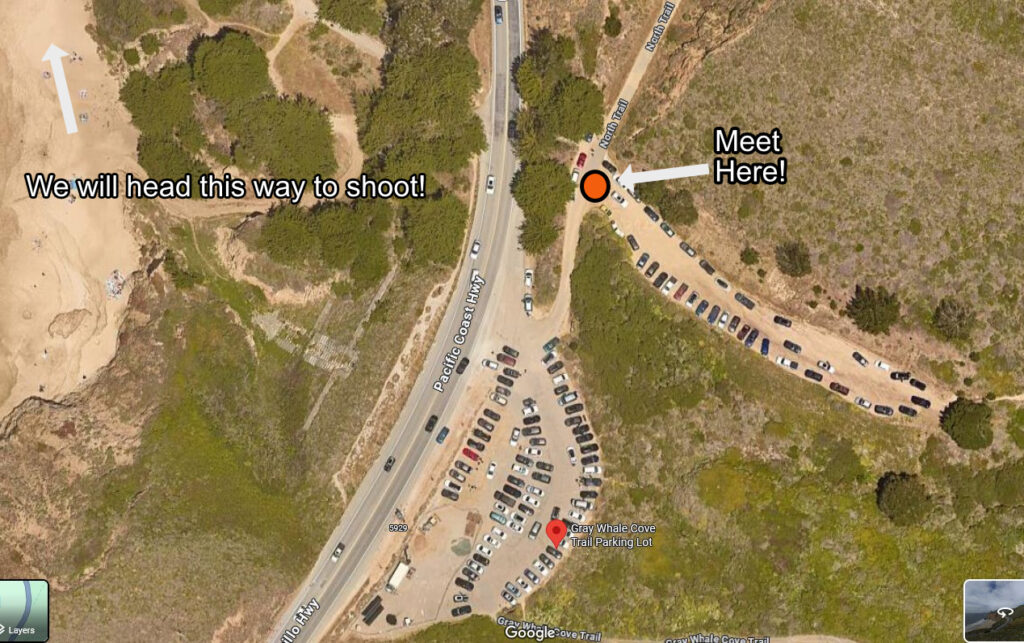 Meet Here in the parking lot! (see photo gallery below!!)  The beach is called Grey Whale Cove. You cross the highway and there’s a gate to the right that leads to a trail with stairs down to the beach. – Come early, because if you are late, you may not find us, once were shooting on the beach! Bring water and pack light!)